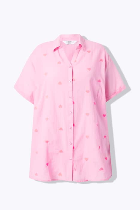 Bluse, oversized, mit neon Erdbeeren-Stickerei. Hemdkragen, überschnittene Schultern, Knopfleiste. Halbarm mit fixiertem Umschlag. Seitenschlitze.