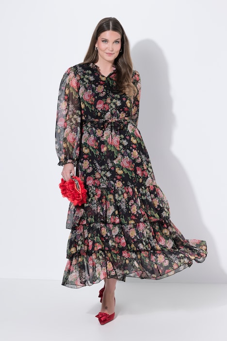 Maxikleid, Blüten, Chiffon, Stehkragen, Langarm