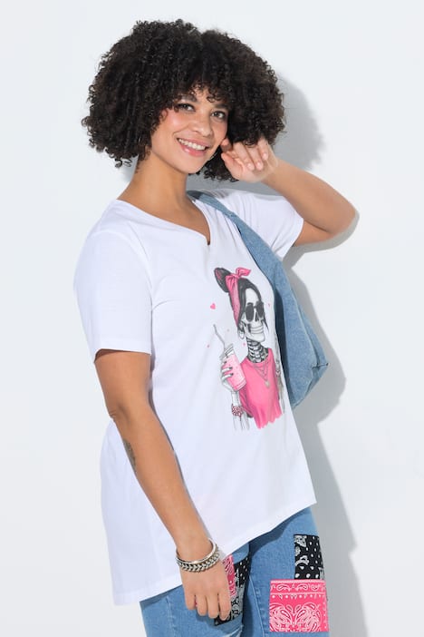 T-Shirt, A-Linie, aus weichem Jersey mit Totenkopf-Dame. V-Ausschnitt, Halbarm. Saum hinten länger.